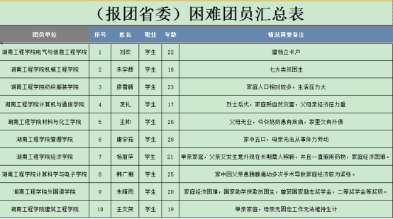 为提升服务青年能力,切实帮助广大团员解决实际问题,根据《共青团湖南省委关于团费收缴、使用和管理的规定》第十八条,团湖南省委拟使用结存团费在全省范围内补助生活困难的团员。根据团省委帮扶困难团员摸底调研通知,对我校困难团员摸底调研,经各学院团总支推荐,校团委核查,决定推荐电气与信息工程学院刘欢等10名贫困团员为团省委帮扶困难团员对象。公示期为12月23日至27日,如有异议,请于公示期内实名向校团委反映,联系电话:58683662。