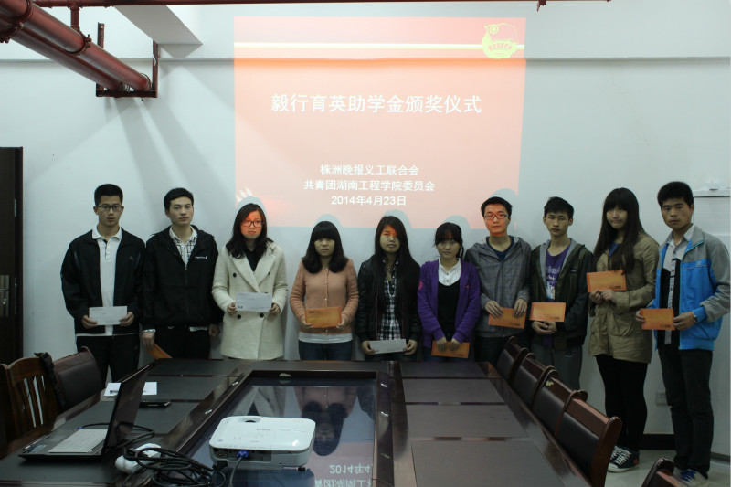 4月23日13:00,由株洲晚报义工联合会和我校团委联合创办的“毅行育英助学金”颁奖仪式在我校体育馆108会议室正式启动。参加此次颁奖仪式的有株洲晚报义工联合会秘书长、萤火虫公益助学行动发起人李珏舟先生、校团委书记黄中华和萤火虫公益助学行动的相关负责人,团委涂璐主持会议。