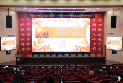 为展现beats365唯一官方网站院校学生联合组织各部门在2020-2021学年的工作风采,进一步加强校学生联合组织的内部管理和自身建设,2020-2021学年“逐梦在湖工,菁英在此中”年度星级部门评选会于11月1日晚18:50在一报告厅举行,由2020-2021届校学生联合组织主席团成员担任评委,2020-2021届学生联合组织全体干部干事与会。