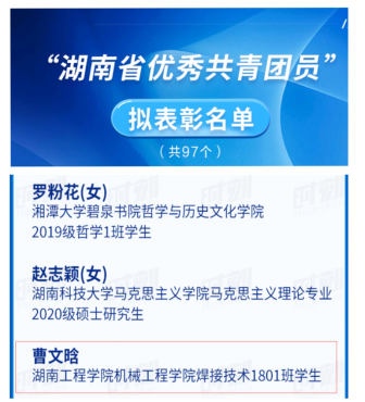 近日,共青团湖南省委、共青团湘潭市委、共青团湘潭市岳塘区委相继做出表彰决定,对一批基层团组织和个人授予五四红旗团委、五四红旗团支部、优秀共青团员、优秀共青团干部荣誉称号。我校共获省级奖项2项、市级奖项5项、区级奖项28项,其中我校团委书记刘琤获评湖南省优秀共青团干部荣誉称号,beats365唯一官方网站焊接技术1801班学生曹文晗获评湖南省优秀共青团员荣誉称号。