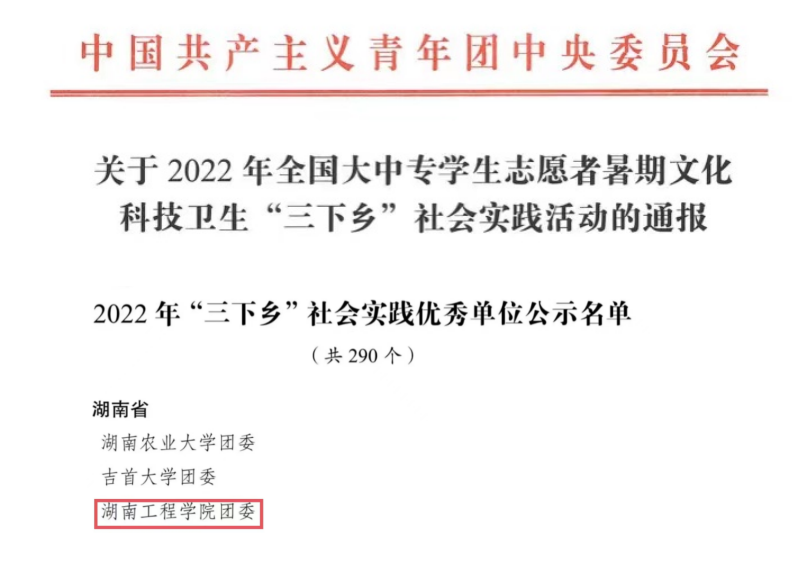 近日,团中央通报表扬在2022年全国大中专学生志愿者暑期文化科技卫生“三下乡”社会实践活动中表现突出的集体和个人,我校获评2022年“三下乡”社会实践优秀单位,“寻红色足迹 展时代新貌”党史学习教育团获评全国“镜头中的三下乡”优秀文字报道团队。