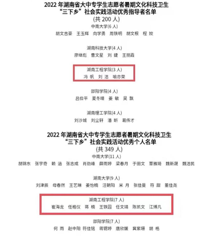 在全省暑期社会实践活动评选中,“喜迎二十大 永远跟党走”党史学习教育实践团和赴湘西土家族苗族自治州凤凰县菖蒲塘村民族团结实践团获评“优秀服务团队”,冯帆、刘洁、喻亦荣3名指导老师获评“优秀指导者”,崔海龙、任格仪、蒋楠、王铁园、任文靖、陈凯文、江博凡7人获评“优秀个人”。