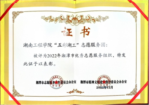 在12月9日市文明办、市志工办开展的2022年湘潭市志愿服务先进典型发布活动中,我校“五彩湖工”志愿服务团荣获“2022年湘潭市优秀志愿服务组织”称号,是全市唯一一支高校获奖团队。