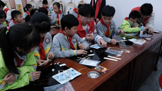 我校宣讲团成员给湖湘小学学生演示手电筒的安装过程