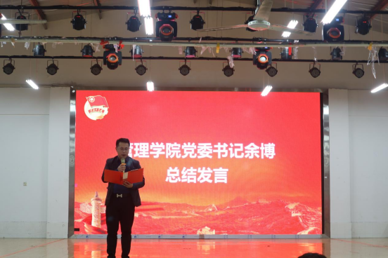 管理学院党委书记余博作总结发言。他希望团员青年不忘初心,坚定不移跟党走;树立理想,传承奋斗担当;努力学习,勇于开拓创新,在新时代继续发扬五四精神,以实现中华民族伟大复兴为己任,不辜负党的期望、人民期待、民族重任,不辜负伟大时代。