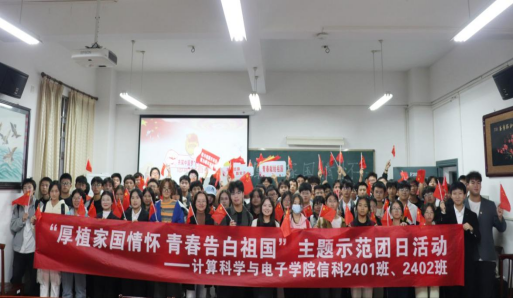 为深入贯彻落实学校“三色教育”理念,发挥共青团育人功能,10 月 24 日下午,计算科学与电子学院在主教学楼 F205 举行“厚植家国情怀 青春告白祖国”主题示范团日活动。学院学生辅导员、新生班主任、各年级团支书及信息科学2401班、2402班共 100 余人参加。