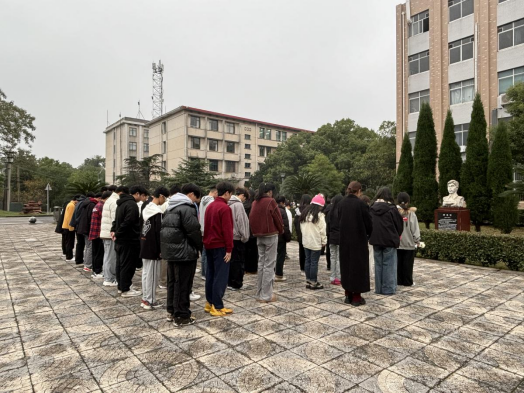 纺织服装学院团总支书记傅静琳向大家分享了学院宗玉宝烈士奋不顾身跳入湘江抢救同学,献出了自己年仅23岁生命的英勇事迹和牺牲精神,并组织全体成员前往主校区(北)宗玉宝烈士雕像前静默致哀三分钟,鞠躬后向雕像献上鲜花。