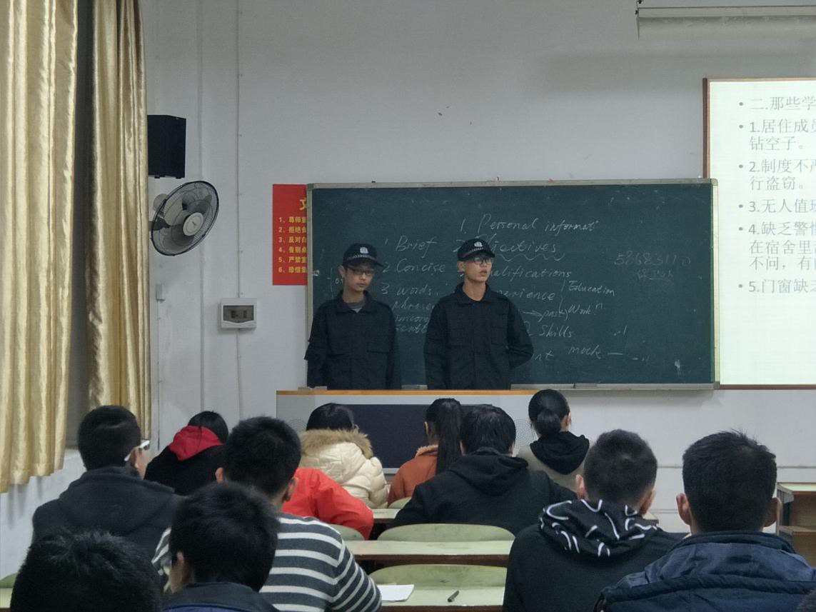 本次下班宣传共分为六个小组,各小组成员一同精心准备宣传PPT课件长达半个月,在此期间,ppt、演讲稿经过反复修改,千锤百炼,旨在为管理学院的同学们作出最有效的宣传。在防盗的问题上,讲解者通过举“顺手牵羊”、“趁虚而入”“钓鱼”等例子并剖析容易失窃的时间段来诠释偷盗者的无孔不入。无论是在宿舍,校园,还是社会公共场所,一旦被盗,一定要采取有效的解决措施。在讲解的过程中讲解着提出了多项行之有效的措施。同样,在防骗的问题上,讲解者也是举了如“电话骗局,合同骗局”等十余种骗局来警醒各位同学。对于防抢,讲解者一再要求同学们要提高警惕性,并提醒各位女同学不要单独出校。