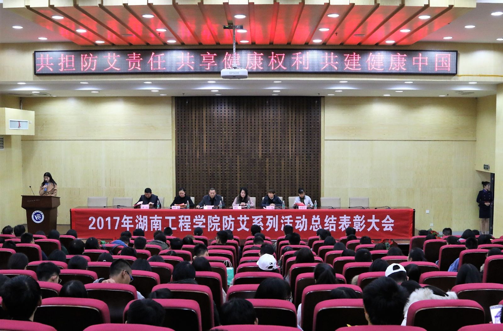12月12日周二下午,我校在图书馆二报告厅举行了2017年度防艾主题宣传周闭幕式暨总结表彰大会。我校后勤处处长颜卫人,岳塘区疾控中心副主任廖奇志,校宣传部副部长李艳红,校学生工作处副处长兼团委副书记刘琤,校后勤处副处长黄闯,校医疗服务科科长谢爱云出席了本次大会。