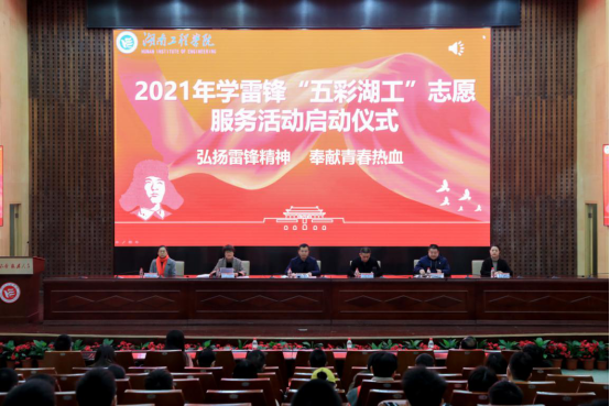 会议宣读了《积极践行雷锋精神 做新时代文明大学生倡议书》,号召全校师生积极投身学雷锋志愿服务,用高尚的道德情操和文明的实际行动带动和感染周围每一个人。雷锋社指导老师计算科学与电子学院杨俐和志愿者代表设计艺术学院张梦秋同学分别发言,和大家分享了志愿服务的心路历程和经验。在现场全体志愿者高呼“我骄傲,我是志愿者”的青春誓言下,代表“五彩湖工”志愿者十大行动的志愿团队代表依次走上主席台,郑重地从张小刚手中接过了“五彩湖工”志愿旗帜,把全场气氛推向了高潮。