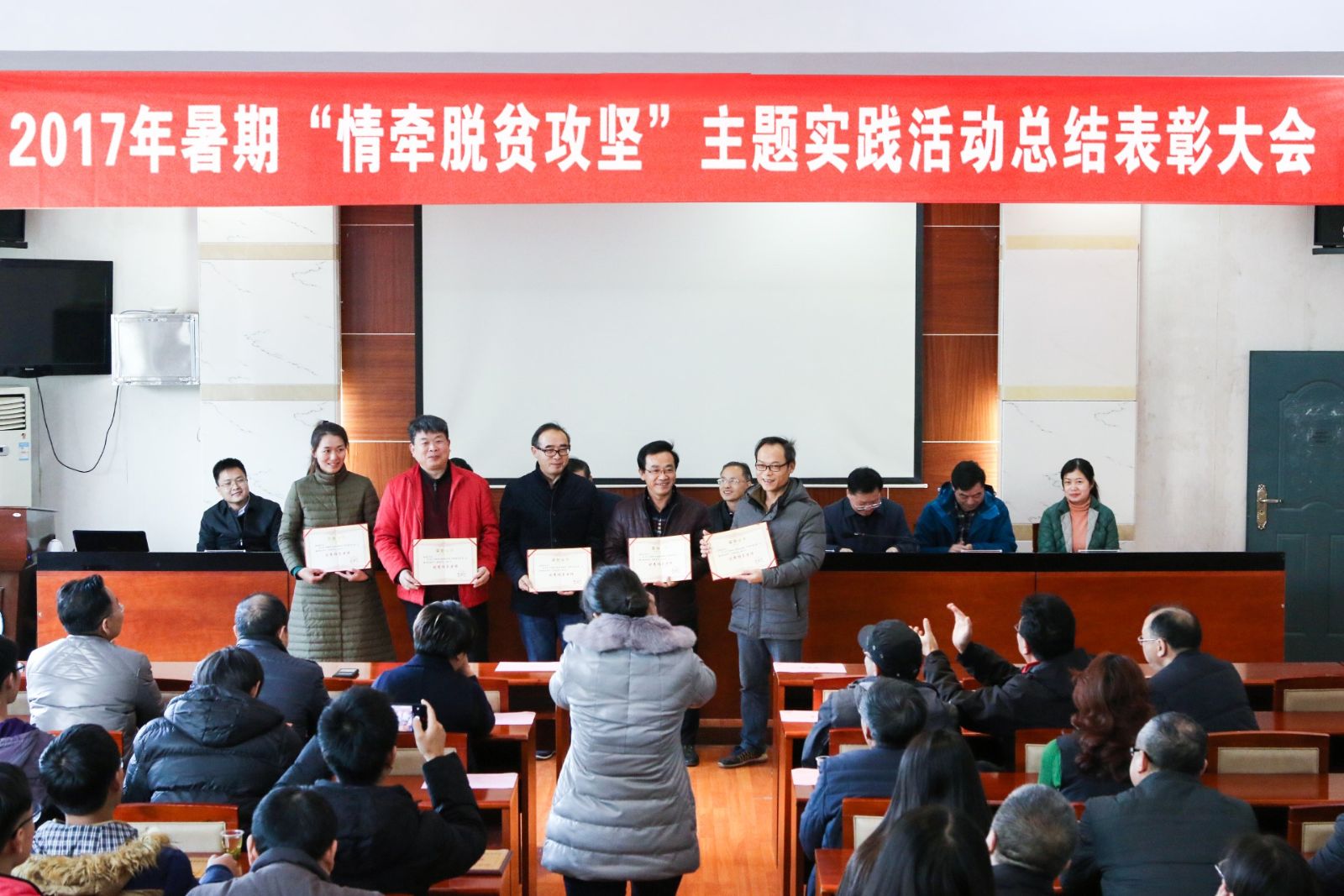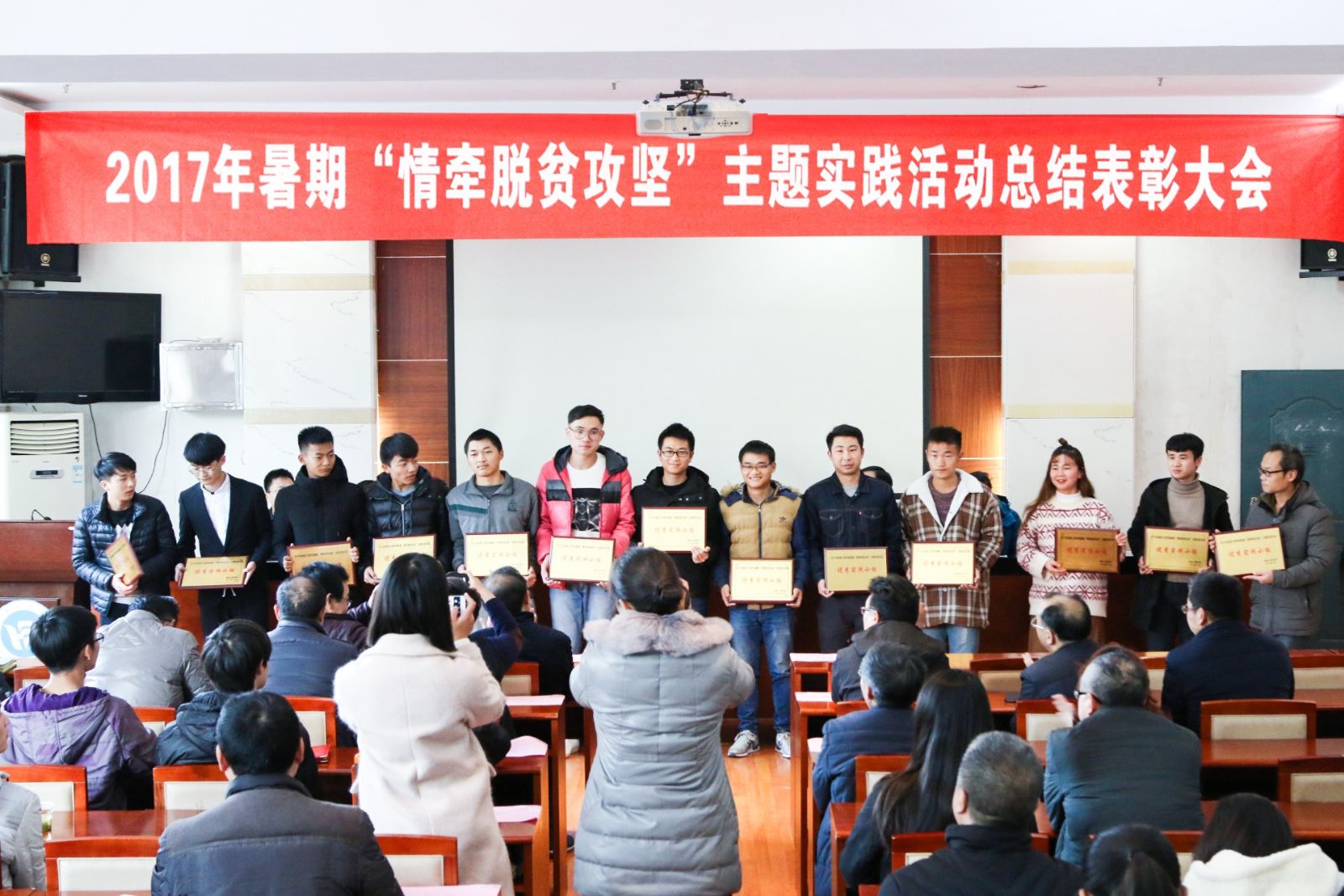 会议首先由刘涛宣读关于表彰暑期“情牵脱贫攻坚”主题实践活动的决定文件。大会对1个省级优秀组织奖、2名优秀省级指导老师、5名省级优秀志愿者、13个校级优秀实践小组,13名校级优秀大学生志愿者、5名校级优秀指导老师、6名校级优秀实践工作者进行了表彰。优秀指导老师代表胡爱钦、优秀大学生志愿者代表曾杰、杜家鑫分别上台发言。