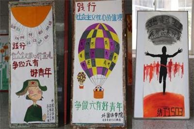 10月10日,在“培育和践行社会主义核心价值观”主题团日活动开展之际,校团委组织各学院在主教学楼大厅将活动主题宣传海报进行了集中展示,营造活动氛围。校团委全体老师和各学院团总支书记同部分青年学生一道观看了主题海报展,并就如何培育和践行社会主义核心价值观进行了深入交谈。随后几天,各班级团支部通过重温入团誓词、观看争做六有青年视频、欣赏爱国影视歌曲、组织文艺表演、演讲辩论比赛、横幅签名等多种形式,深入浅出的阐明了社会主义核心价值观的内涵,有效引导和帮助了青年学生牢记、理解、践行“六有”大学生的内在要求。同时,还评选出了“十佳团日活动”。