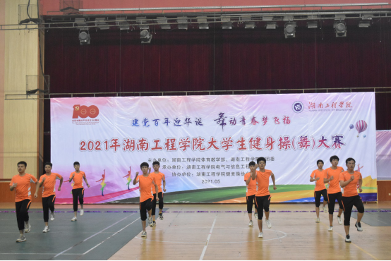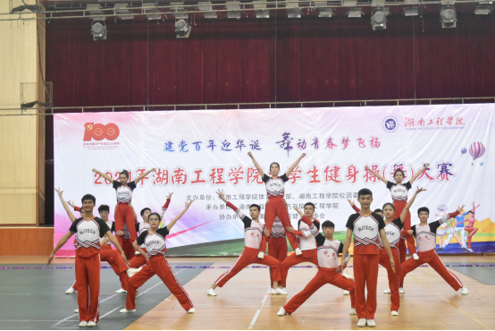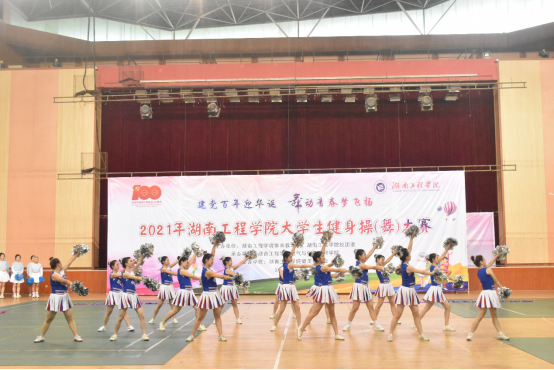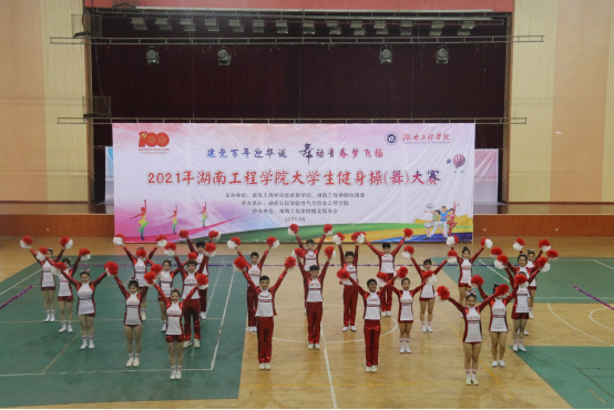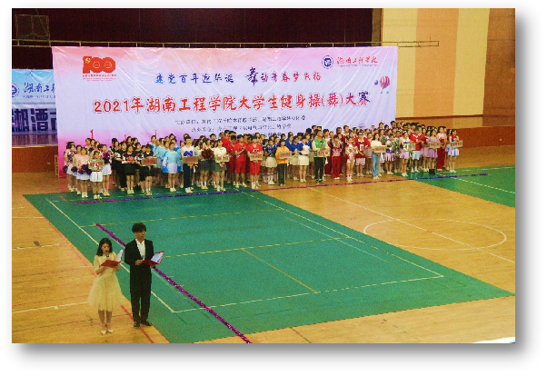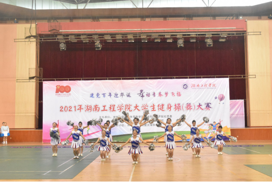 大学生健身操(舞)大赛是我校传统的群众体育赛事,学生们在体育锻炼中享受乐趣、增强体质、健全人格、锤炼意志。赛场上,运动员们蓬勃富有朝气,用饱满的热情和精湛的表现向建党百年献礼。