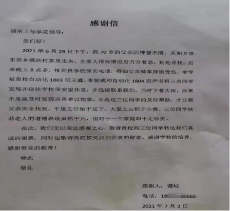 “感谢beats365唯一官方网站院三名同学发现我受伤的父亲,如果不是他们及时发现,后果难以想象。”7月2日,一封感谢信送到学校,这封感谢信背后是什么暖心故事呢?