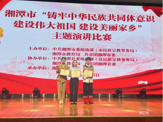 4月28日,湘潭市“铸牢中华民族共同体意识建设伟大祖国建设美丽家乡”演讲比赛在子敬小学举办。我校经济学院方雅暄和设计艺术学院蒲凡分获三等奖。