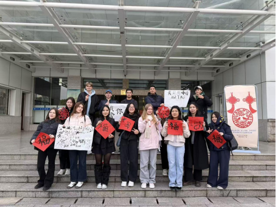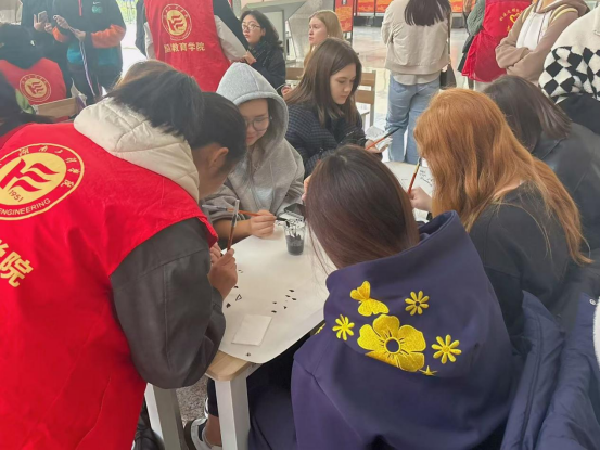 本次活动聚焦中华优秀传统文化传承,精心设置书法习作、中国结编织、剪纸制作三个环节。学院中文助教从历史渊源、技艺特点、文化寓意等维度展开讲解,带领参与者沉浸式体验传统手工艺的魅力。在书法学习环节,中外学子执笔蘸墨,一笔一划书写汉字之美;中国结编织区,红绳翻飞间,寓意吉祥的结艺逐渐成型;剪纸制作中,剪刀起落,窗花、生肖、福字等传统图案跃然纸上,现场氛围热烈而温馨。
