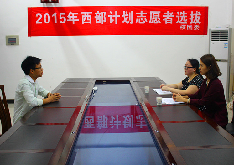 6月3日上午,我校2015年西部计划志愿者募招面试在体育馆108举行。校团委办公室主任涂璐和学生心理健康教育与咨询中心陈竹老师担任面试官,胡仲科、王慧君等来自我校各个学院4名候选人参加了此次面试。