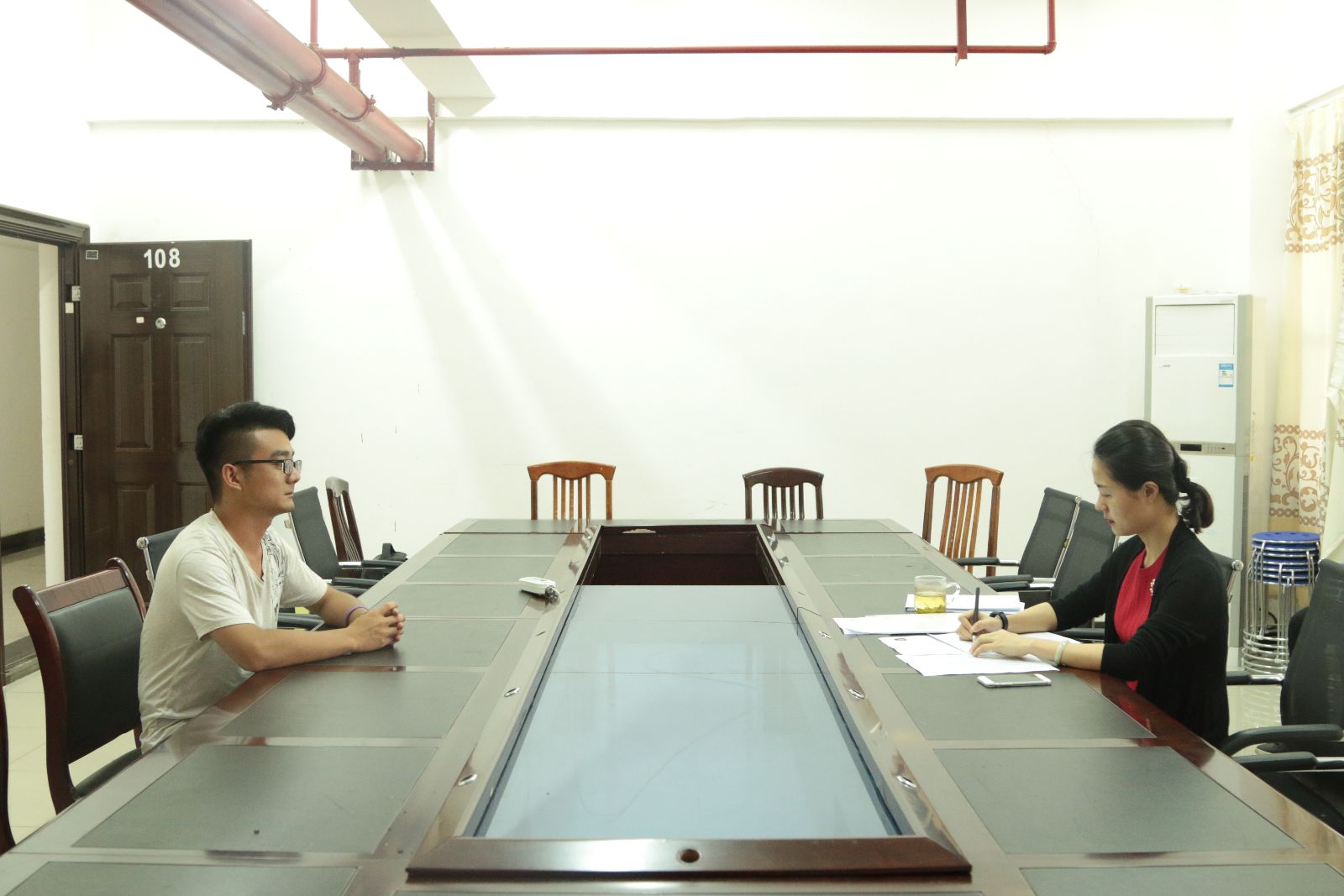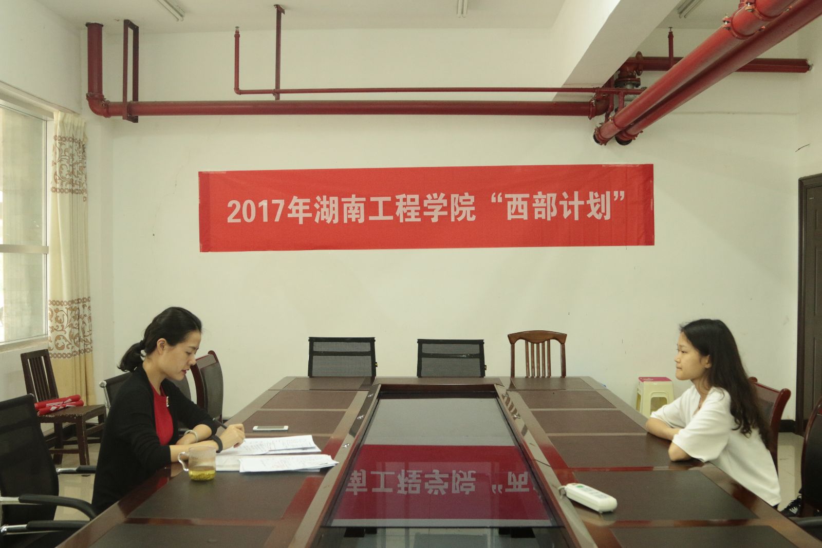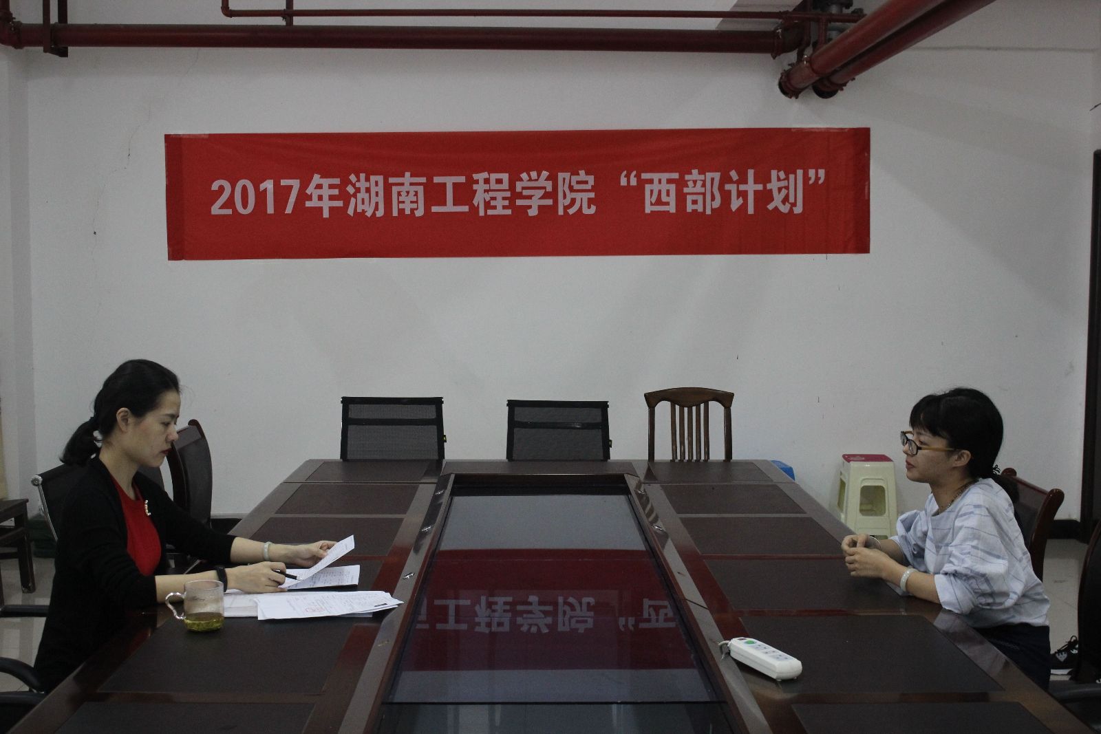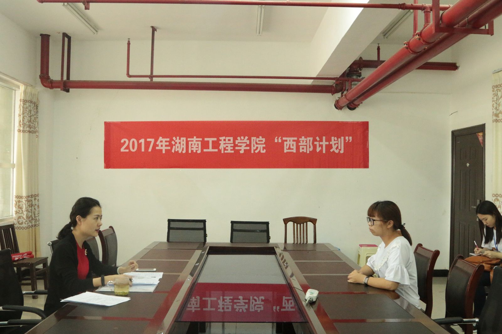 6月14日,我校2017年西部计划志愿者招募选拔面试在体育馆108会议室举行,校团委老师担任评委。
