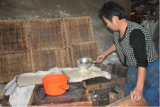 首先,贺定粮将浸泡后的黄豆磨成豆浆,并将豆浆倒入柴火灶台上的那口大铁锅里进行加热,贺定粮说“我们一直坚持用柴火灶煮豆浆,用大锅柴火煮的豆浆会留下很厚的一层糊底,如果用机器做出来的豆腐就没有锅底。”在煮热豆浆的同时,贺定粮在一口大缸里加入一点罗汉山的山泉水,和一些石膏,再用刷子将之混合,她一边忙碌着,一边向大家讲解“这是石膏,在豆浆里加入一点石膏可以让豆腐更好地成型。”贺定粮将烧好的热豆浆倒入这口大缸后,稍等片刻后,待热豆浆变成豆腐花,再将豆腐花倒入木箱格,铺上一层白布,等它冷化成型过后,白豆腐也就做好了。最后,她将做好的白豆腐从木箱格里倒在板子上,再用刀按线路切成三十二块小豆腐。