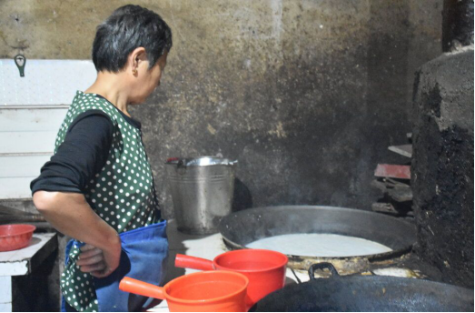 凌晨4:00,实践团队便迎着浓雾踏上了探访花石豆腐制作工艺的路程。一路上,镇上房屋被浓雾环绕,若隐若现,宛如仙境。当实践团队到达王新华的住处时,王新华的妻子贺定粮已将浸泡好的黄豆装在篮筐里,准备研磨。看到实践团队的到来,贺定粮热情地向大家介绍做豆腐的前期准备工作,一边说着一边开始豆腐制作。