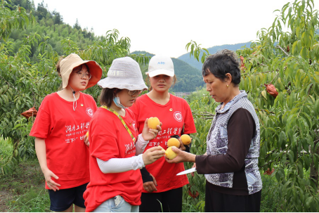 “快来看,我家的黄桃,又大又甜。”实践团来到当地果农黄桃基地,果农宋奶奶向实践团成员介绍了洋岐畲族村高山黄桃的种植情况及如今发展状况。在宋奶奶的带领下,实践团参观了她家的黄桃种植基地。果园里的黄桃色泽诱人、香味扑鼻、鲜嫩水灵、果肥汁甜。她告诉实践团,过来旅游的游客,不仅可以欣赏当地的风光,还可以来黄桃基地采摘黄桃,既保证果子的新鲜,也享受农家乐趣。洋岐畲族村用这样的销售方式吸引了不少游客,扩大当地人流量,提高利润。