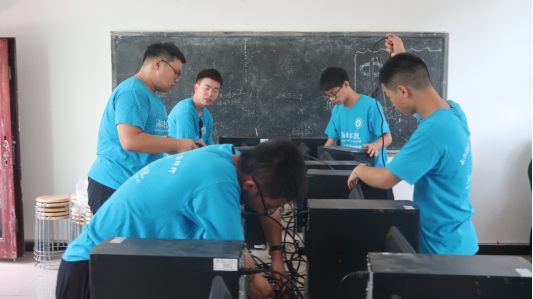 布置长桌,装配电脑,传接电线、网线,打扫教室卫生……在另外一间教室里,计算机与通信学院实践团成员们正紧锣密鼓地设置“信息技术教育实践基地”。他们将围绕乡村振兴,以互联网和大数据等新一代信息技术,发挥科研育人、实践育人的重要作用。据了解,在现场实践活动完成返校之后,实践团成员还将通过线上的方式对孩子们进行教学,继续关注他们的学习与成长。