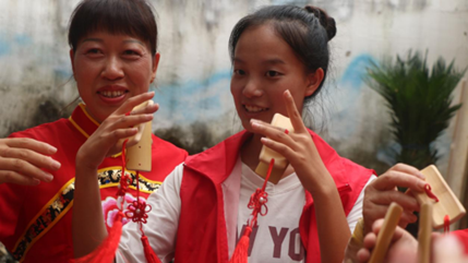 观察团拜访当天正赶上熊老先生的艺术团彩排,艺术团为观察团带来了一段长沙弹词《捡了宝贝的娘》快板剧表演,艺术团全情投入,节奏明快,词句顺口、“接地气”,表演结束满堂喝彩。观察团成员跃跃欲试,都想亲身体验快板的魅力,熊老先生悉心指导学生体验快板打法。观察团成员何梓恒说:“今天我不仅欣赏了快板剧,自己还学习了怎么打快板,我感觉长沙快板很有意思,回去之后我也会买个快板研究研究。”