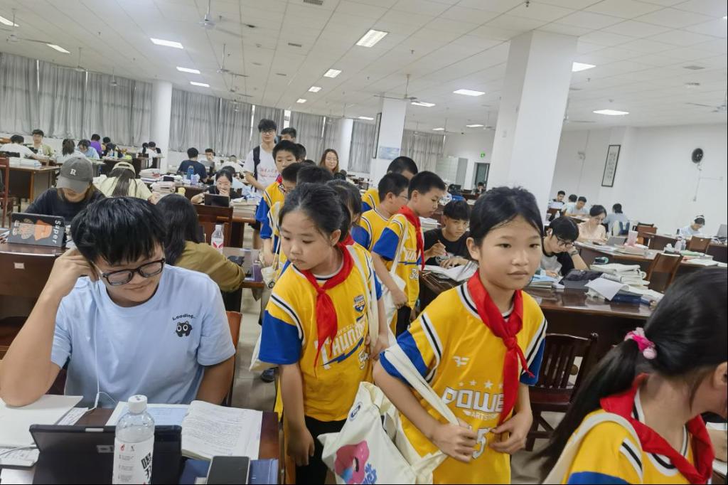 最后,孩子们来到学生自习室,自习室中每一位正在奋斗的学生都让图书馆的书意更浓,孩子们看着正在努力学习的哥哥姐姐们,眼神中充满着对未来的憧憬,此刻榜样的力量变得具象化,坚定了孩子们“为中华之崛起而读书”的决心。