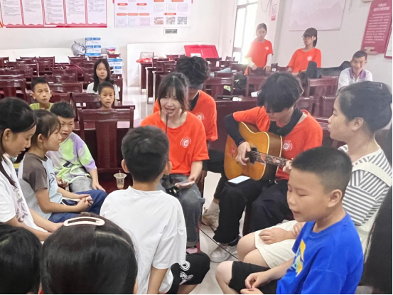 为关爱花果山村儿童健康成长、丰富其假期生活,实践团围绕“运动、美术、音乐、手工艺品制作”等方面进行兴趣教学,丰富他们的课余知识。实践团成员通过进行“击鼓传花”“抢凳子”等破冰小游戏拉近与小朋友们的距离,了解每个小朋友的基本情况和兴趣爱好。实践团成员们还为小朋友们进行了防溺水等安全教育,通过教授安全口诀操和手势舞的形式加深安全意识。篮球架下,实践团成员耐心地教导每一个动作、每一个传球姿势;手工课上,实践团成员一手持剪刀,一手持样品,细心地讲述着剪纸需要注意的事项。休息之余大家带领数十名小朋友一起合唱《童年》等歌曲,“盼望着假期,盼望着明天,盼望长大的童年”。实践团成员以多彩有趣的形式寓学于乐,小朋友们积极参与,教室内充满欢声笑语,在团队成员们的陪伴中丰富了假期生活。