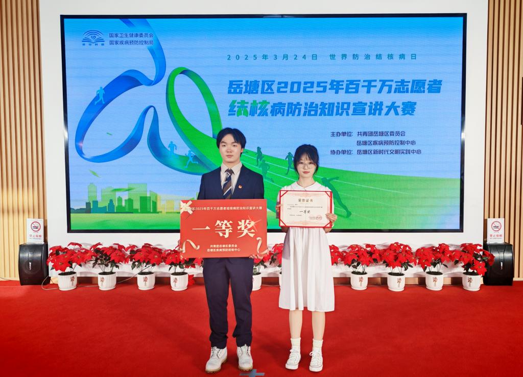 3月24日下午,由共青团岳塘区委员会、岳塘区疾病预防控制中心联合主办的岳塘区2025年百千万志愿者结核病防治知识宣讲大赛在岳塘区新时代文明实践中心举行。我校由“五彩湖工”志愿者、校红十字协会会员何昊城、向苗苗等6人组成的团队获大赛一等奖。