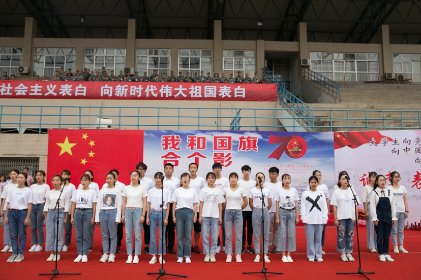 将家国“初心”植心田,将小我融入大我,用青春向祖国告白。为庆祝中华人民共和国成立70周年,9月17日清早,我校在田径场举行“青春告白祖国”活动,身着军训服装的大一新生在鲜艳的五星红旗下唱响《我的祖国》,用歌声向祖国母亲献上最诚挚的祝福。副校长李军林出席活动并讲话,宣传部、学生工作处、团委主要负责人,各学院党总支副书记参加活动。